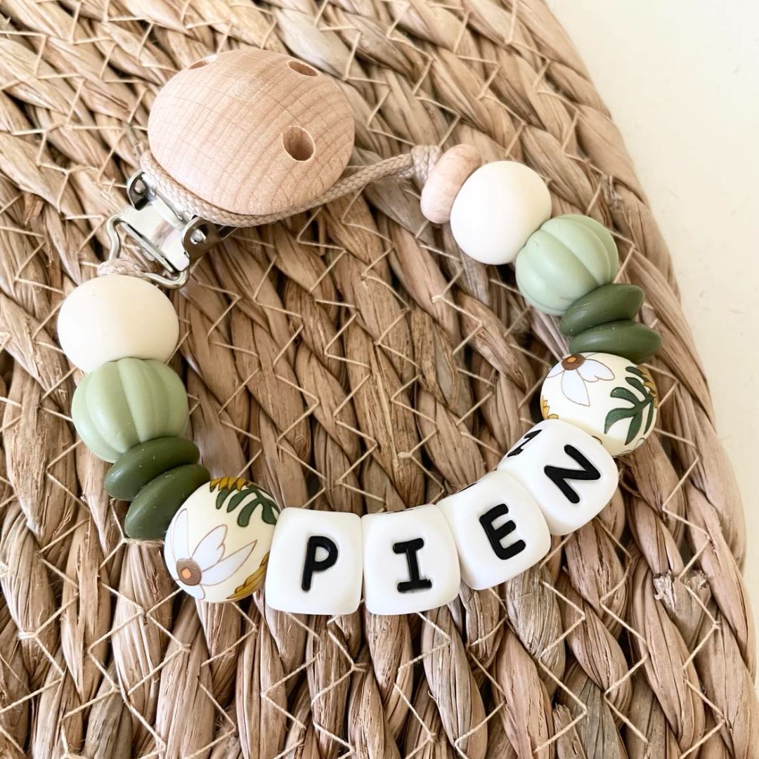 Volgens de veiligheidsnormen mag een tutkoordje max. 22cm lang zijn. Daarom kan het door de lengte van de naam voorkomen dat er enkele kralen worden weggelaten.